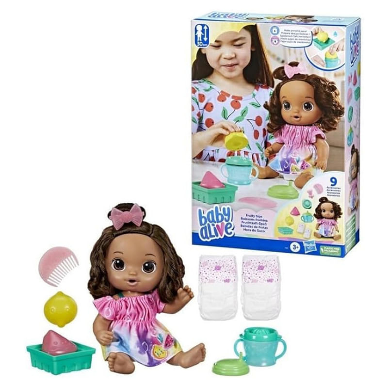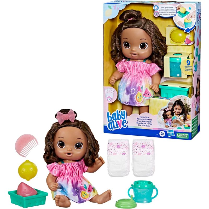 A boneca Baby Alive Hora do Suco Morena da Hasbro transforma o momento da brincadeira em uma experiência cheia de imaginação e cuidado. Com seus cabelos castanhos e um visual encantador, ela permite que as crianças preparem sucos de mentirinha usando a máquina de sucos inclusa, mergulhando e espremendo as frutinhas de brinquedo para criar a bebida antes de alimentá-la com a mamadeira. Ao beber o suco, a boneca faz xixi, tornando a brincadeira ainda mais realista e divertida.
