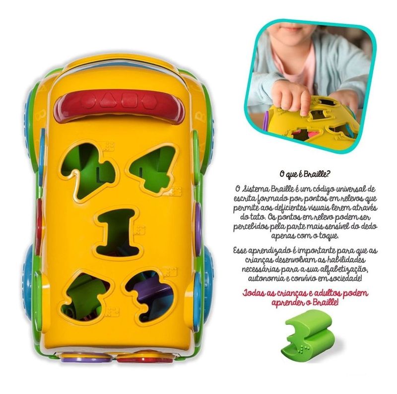 o Ônibus Escolar Tem Diversas Funções Didáticas e Divertidas. Tem Um Porta-Malas Abre e Fecha e Encaixes Numéricos e Geométricos Que Desenvolvem a Coordenação Motora da Criança. Contém Também Um Detalhe Muito Especial: Na Parte de Cima do Ônibus Tem Os Números em Braille (braille É Um Sistema de Escrita com Pontos em Relevo Que As Pessoas com Deficiência Visual Podem Ler Pelo Tato)! Isso Permite Que As Crianças com Deficiência Visual Brinquem e Aprendam Também! Os Detalhes do Caminhão Foram Projetados Para Que Seu Filho (com ou sem Deficiência Visual) Possa Brincar de Forma Segura, Confortável e Muito Divertida!