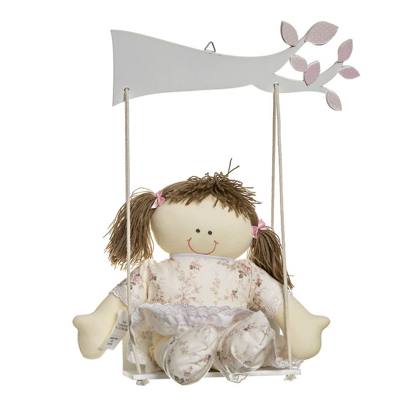 Balanço em madeira laqueada com boneca e suporte em madeira laqueada para o nome do bebê.