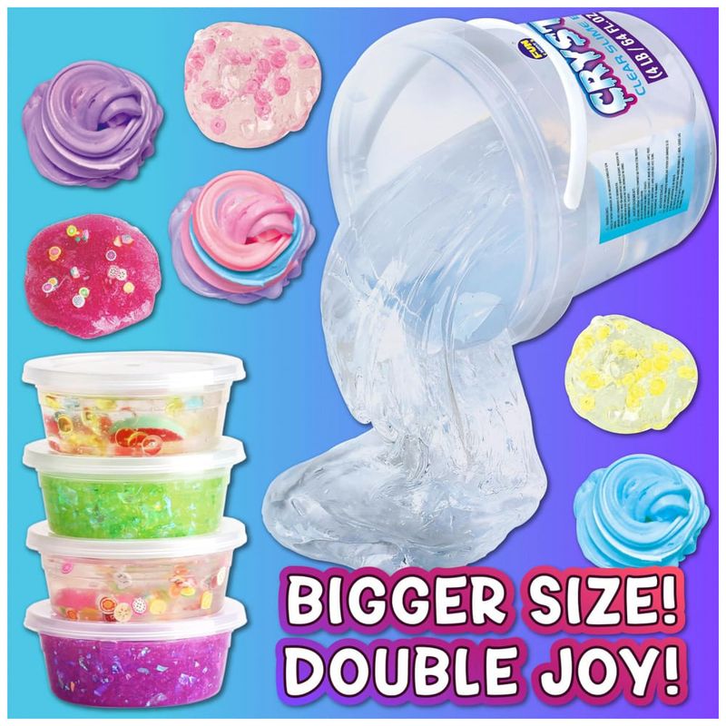 O slime transparente oferece diversos métodos de jogo. As crianças podem fazer bolhas, esmagá-las com um som engraçado de peido e criar slime de cristal encantador com os vários suprimentos fornecidos.