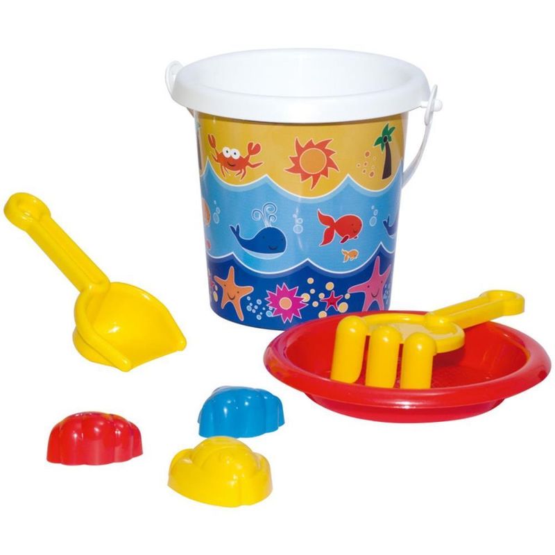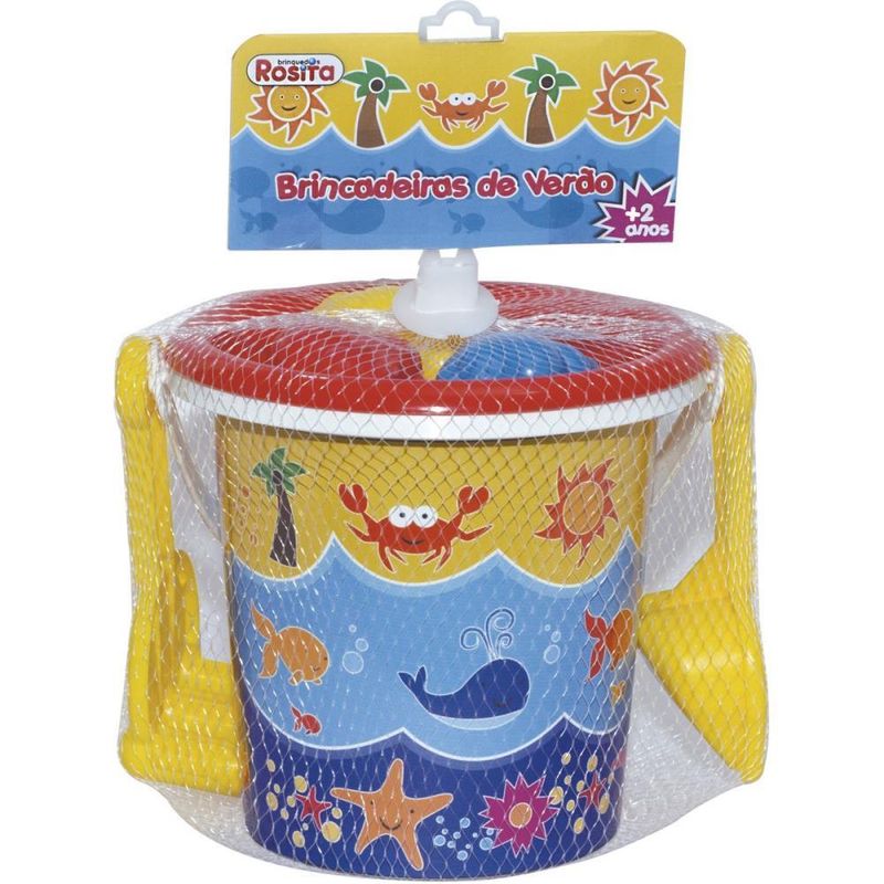 Baldinho de Praia que tem a tecnologia In Mold Label. Acompanha um baldinho, um rastelo, uma pá e três forminhas para brincar na areia.