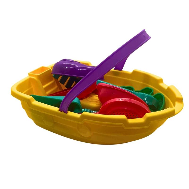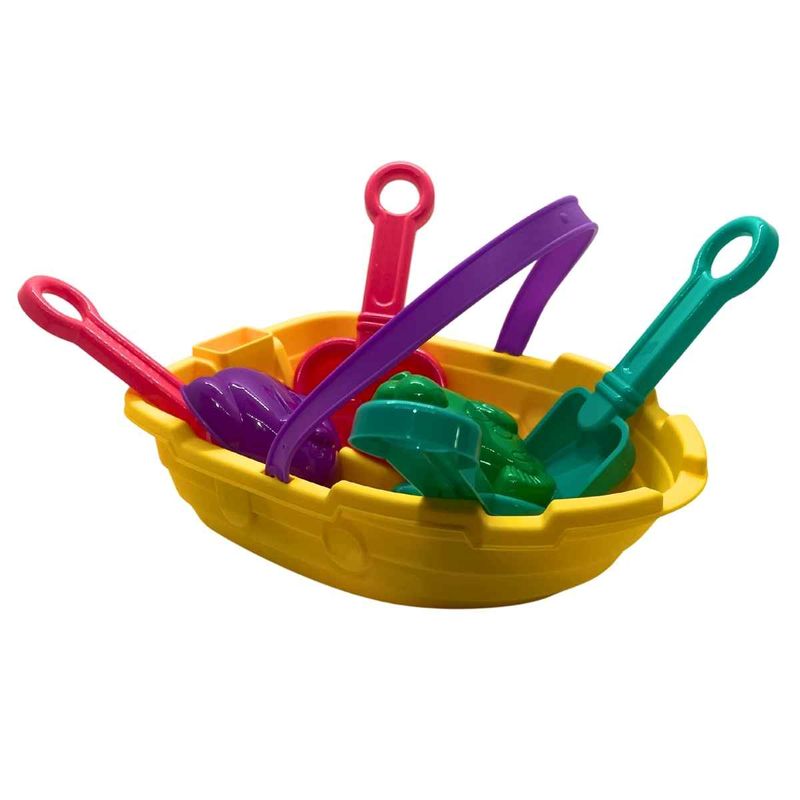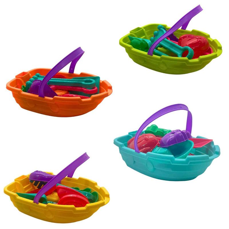 Baldinho De Praia Formato Barquinho Com 7 Acessórios, Pica Pau, Brinquedo P/ Areia Bebês +18 Meses