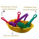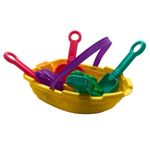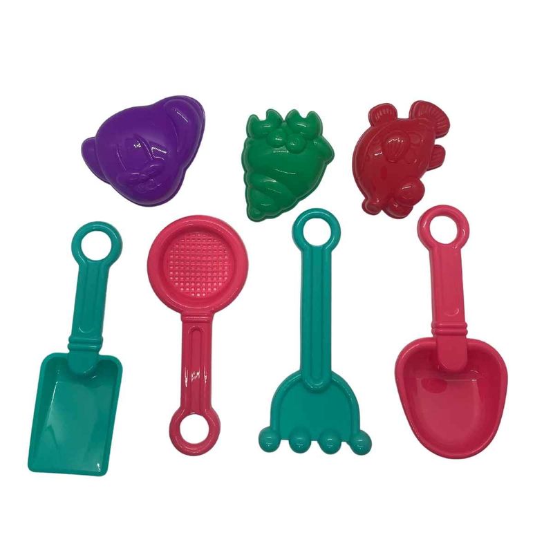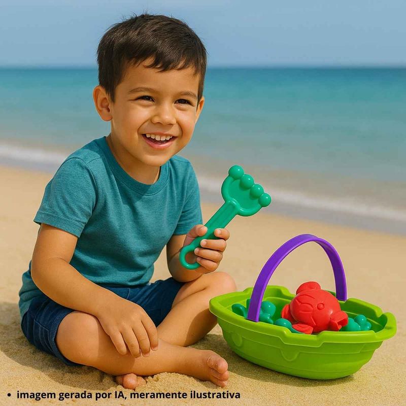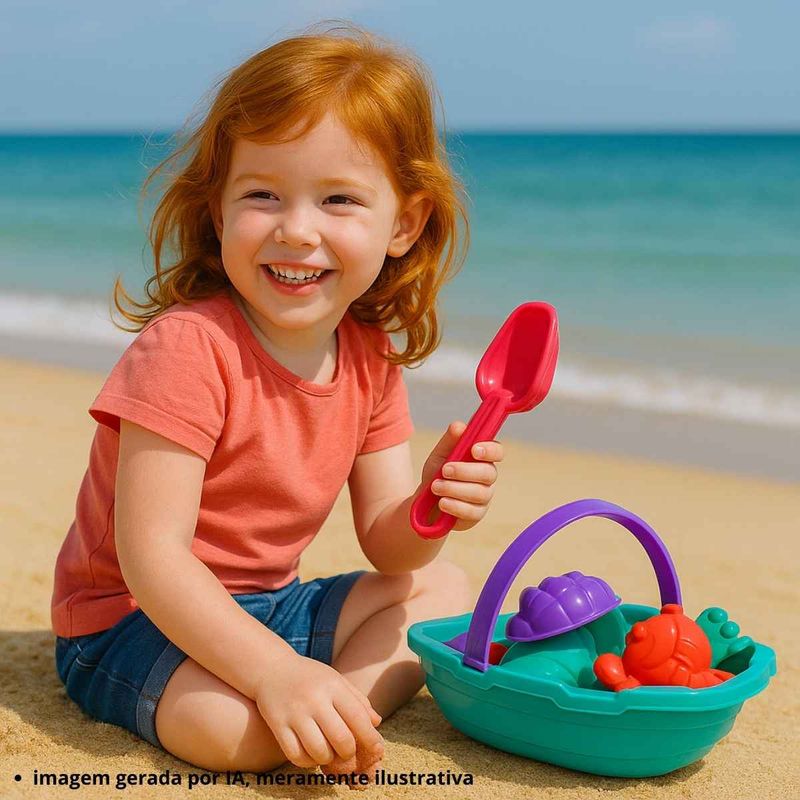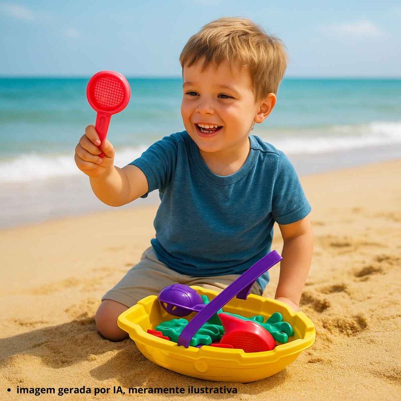Conteúdo da embalagem: 1 barquinho, 1 rastelo, 1 peneira, 2 pás, 3 forminhas