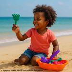 O conjunto inclui acessórios variados, como pazinha, rastelo, moldes e baldinhos, ideais para construir castelos de areia, explorar texturas e criar histórias incríveis. Feito com materiais resistentes e seguros, o kit é leve, fácil de transportar e pensado especialmente para mãos pequenas.