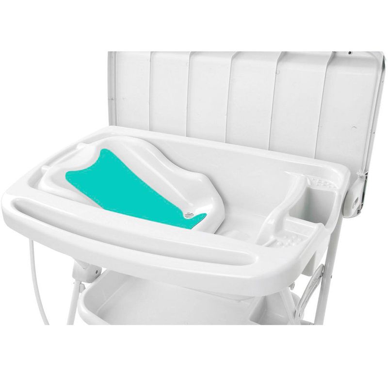 Na parte inferior há uma bandeja para armazenar os acessórios que a mamãe vai precisar para dar banho na criança, mantendo-os organizados e sempre à mão. Possui um amplo tampo de plástico com trocador acolchoado onde a mamãe pode secar e vestir o bebê confortavelmente.