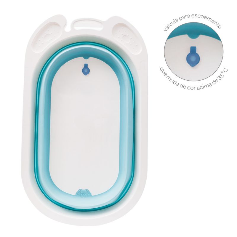 A Banheira Dobrável da Buba e perfeita para viagens e passeios! Compacta e pratica de guardar, possui válvula para escoamento de agua com sensor que muda de cor quando a temperatura está muito alta.