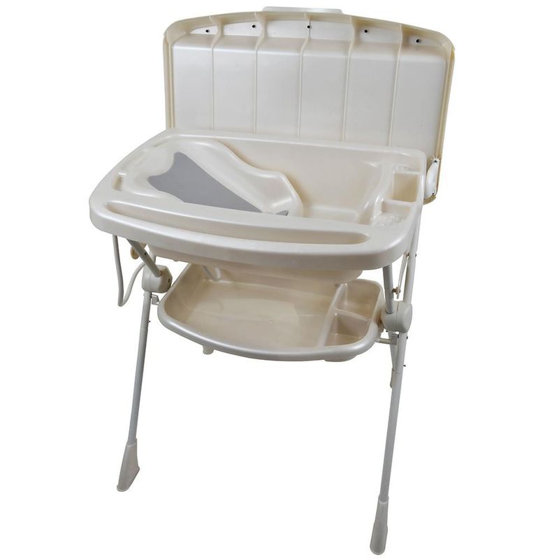 Acompanha assento redutor de profundidade para recém-nascidos, mangueira para escoamento da água e chassi com acabamento branco fosco e partes plásticas em tom perolizado.