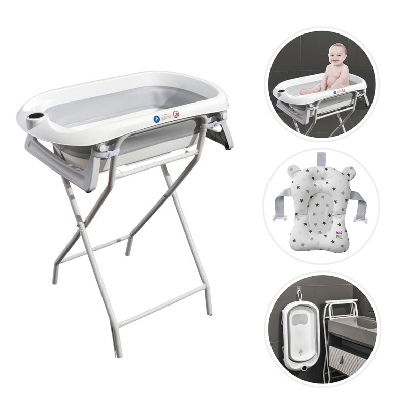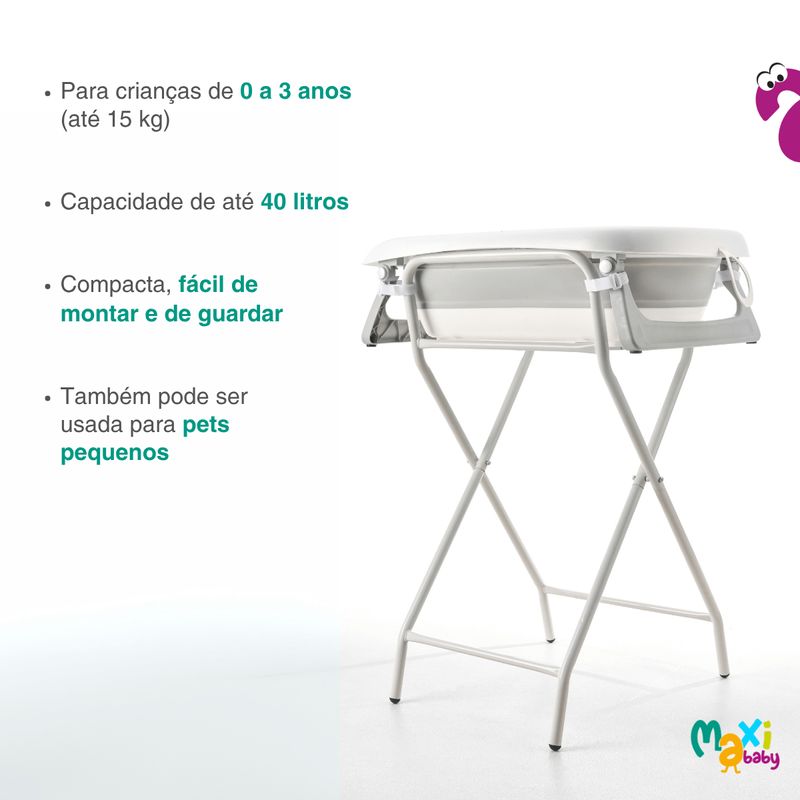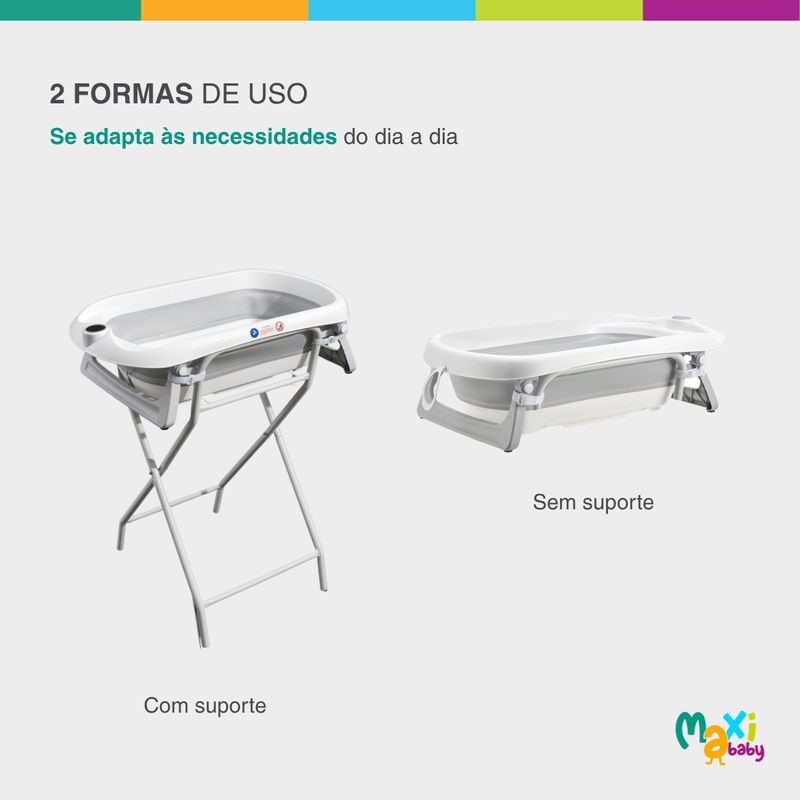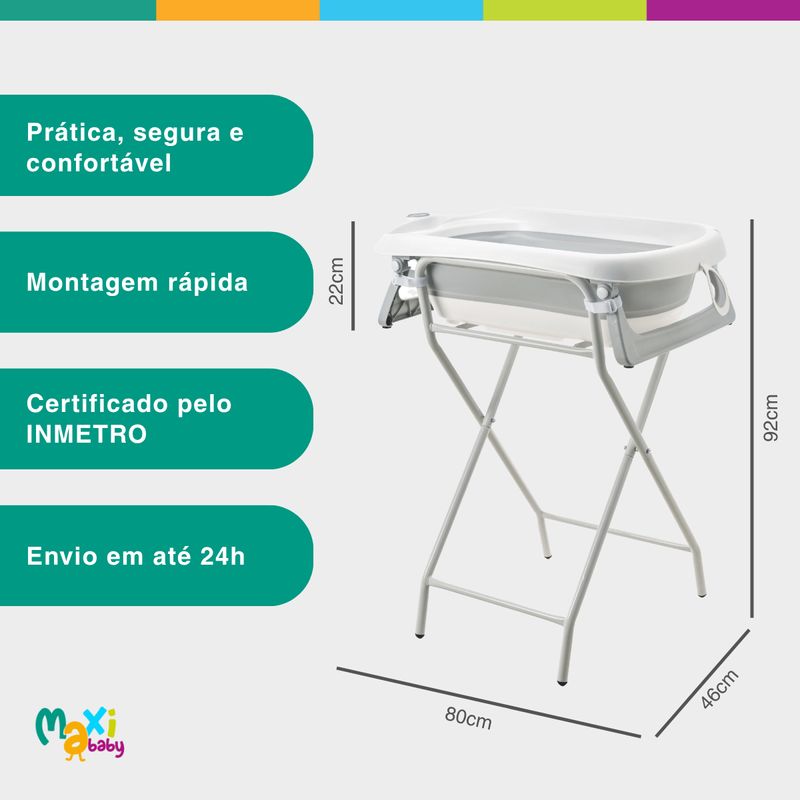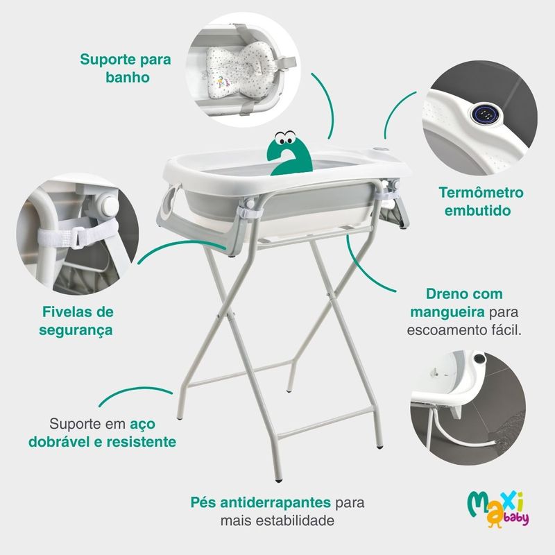 Conta com estrutura ergonômica e termômetro embutido, permitindo o controle ideal da temperatura da água. Almofada suporte de poio interno acolchoado removível oferece maior conforto ao bebê durante o banho, enquanto as 4 fivelas de segurança e os pés com base antiderrapante garantem firmeza e estabilidade ao suporte dobrável em aço.