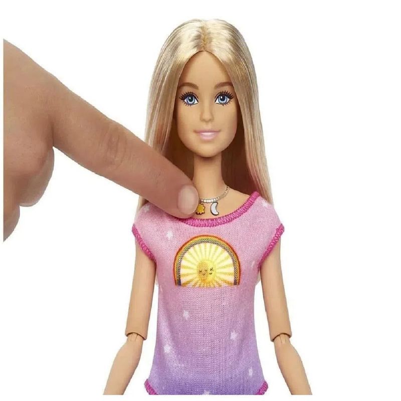 Esta boneca com tema de meditação celebra uma de suas formas favoritas de recarregar as baterias - a meditação da atenção plena, agora com modos Diuno e Noturno. O conjunto vem com uma boneca Barbie, um cachorrinho e três emojis. As crianças simplesmente pressionam um dos 2 botões no colar da boneca Barbie para ativar um dos seis exercícios de meditação guiada que usam efeitos de luz e som para inspirar sua própria prática. Seu filhote a ajuda a visualizar - insira um dos emojis em sua cabeça para representar um balão de pensamento meditativo e, em seguida, troque-o para uma nova inspiração de meditação. A boneca Barbie Medita comigo está vestida com roupas confortáveis e oferece flexibilidade extra para poses realistas e brincadeiras ativas. Ela possui 15 articulações para movimentos e poses mais realistas - no pescoço, ombros, cotovelos, pulsos, coxas, quadris, joelhos e tornozelos. As crianças podem colecionar a boneca de bem-estar Barbie para explorar o autocuidado e expandir seus mundos, porque quando uma menina brinca com a Barbie, ela imagina tudo que pode se tornar.