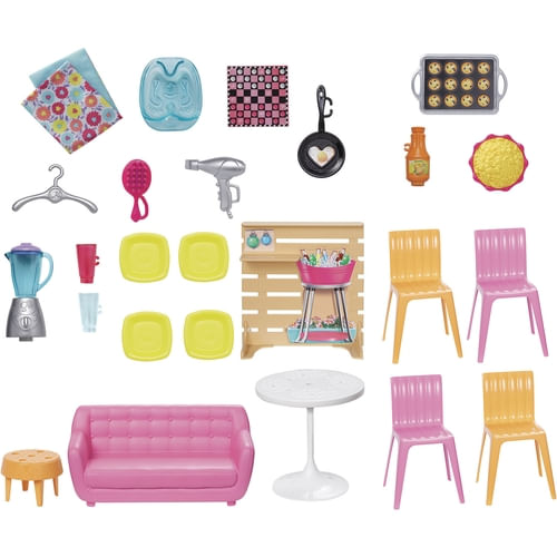 A casa Malibu da Barbie estimula a imaginação a transformar-se em uma casa incrível, pronta para criar mil histórias. Abra-a para revelar uma casa de dois andares com muitos espaços com brincadeiras com divertidas características duplas. A sala de estar se transforma em um cinema em casa, o balcão de smothies se transforma em cozinha e um beliche perfeito para convidados. As características clássicas estão aí também: banheiro com pia, chuveiro, refrigerador, forno e móveis adicionais junto a pequenos acessórios que darão mais possibilidades para as crianças contarem histórias.