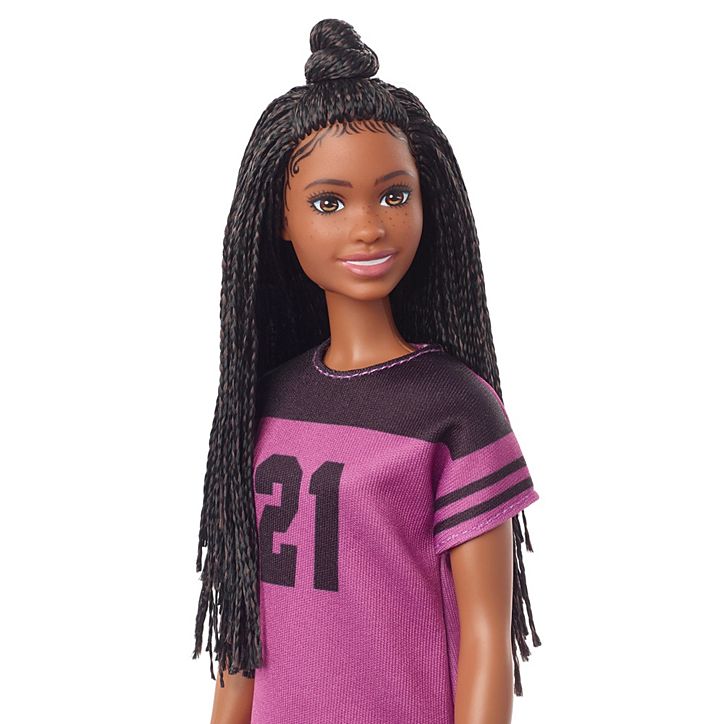 Inspirada em um visual na tela, a boneca Barbie® usa um vestido de jersey descolado e sapatos brancos. Seu cabelo trançado está penteado em um coque moderno.