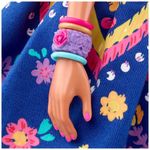 Uma flor vibrante de cempasúchil e uma faixa de cabeça rosa com fitas de streaming completam o lindo visual da boneca Barbie.