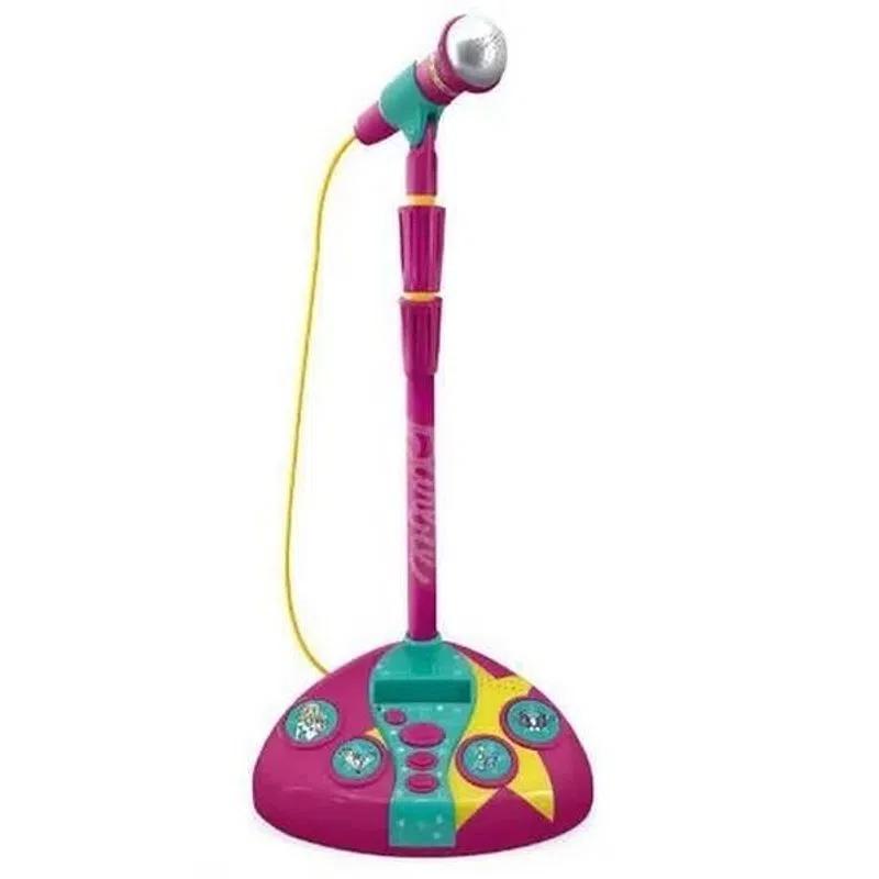 Não deixe sua pequena de fora dessa brincadeira cheia de muita música e alegria. *ATENÇÃO: Telefone celular não acompanha o produto Este microfone possui pedestal, altura regulável, é desmontável, possui entrada para mp3 ou celular, cabo conector, 4 melodias exclusivas, botão liga/desliga e controle de volume.