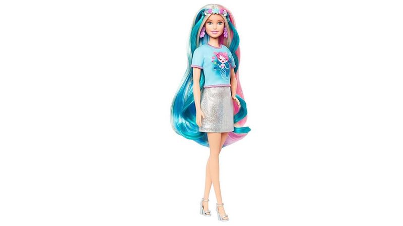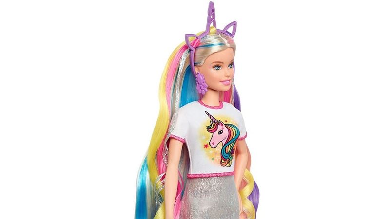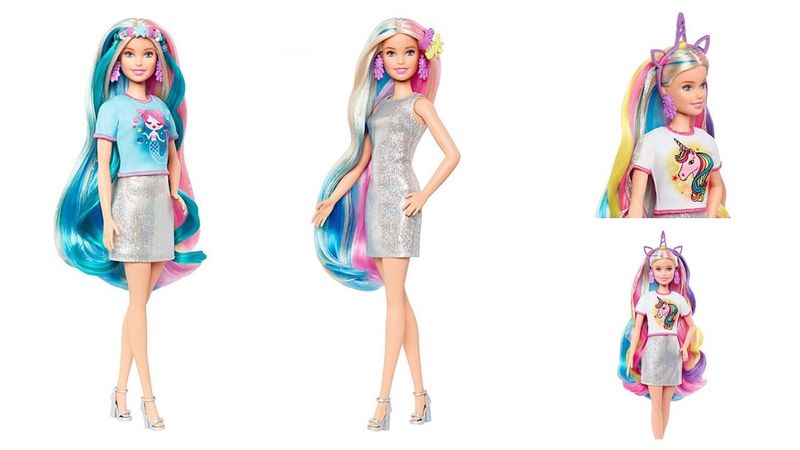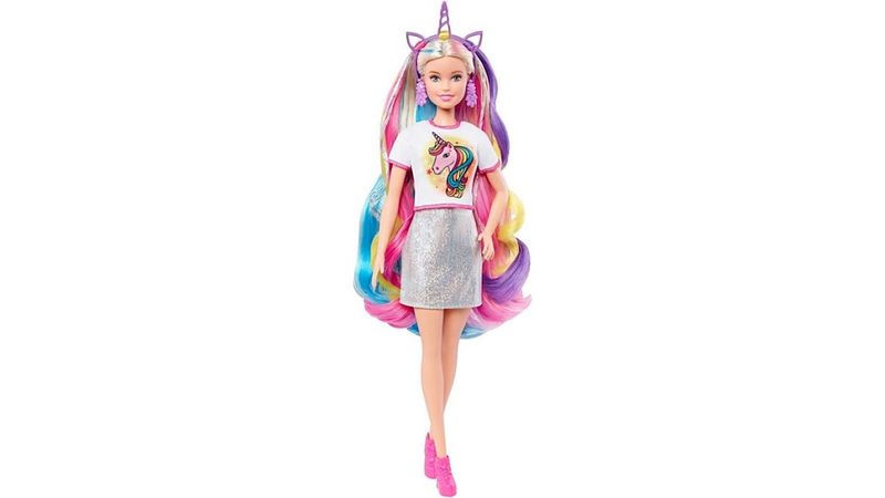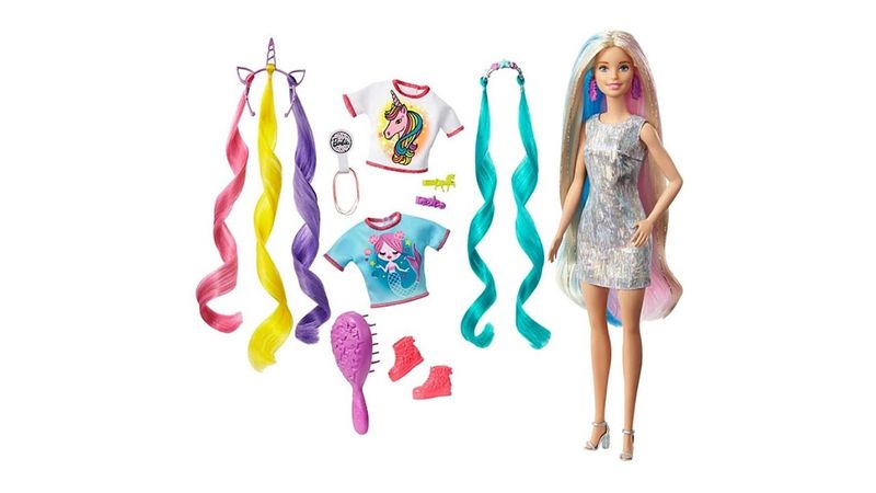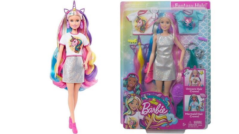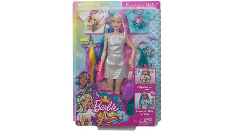 Unicórnio ou sereia? A boneca Barbie® Fantasy Hair ™ não precisa escolher - ela vem com dois looks fantasia, cada um incluindo uma coroa colorida com extensões de cabelo, top temático e acessórios.