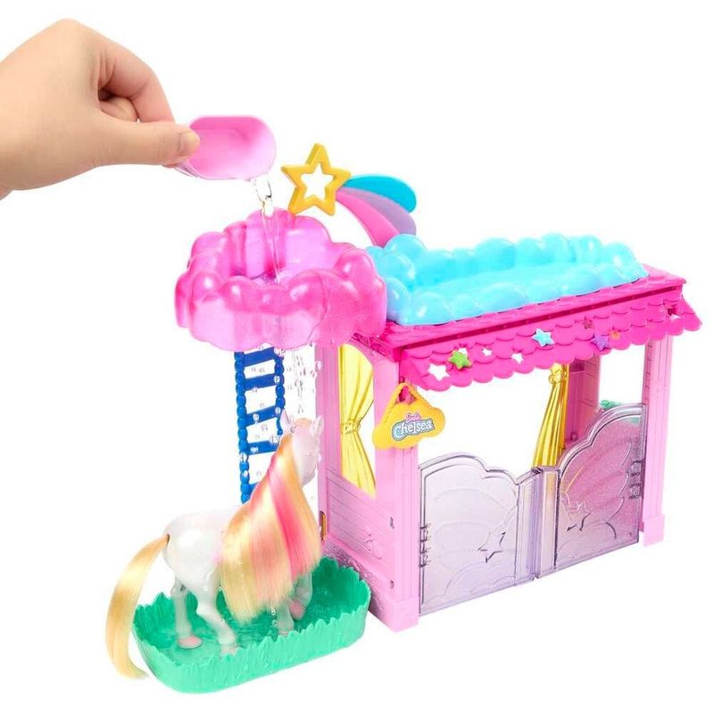 Contém: 1 boneca Chelsea, 1 Pegasus da Barbie, 1 coelho unicórnio, 1 estábulo, 1 escorregador, 1 mesa com duas cadeiras, 1 pente e diversos acessórios. A boneca não fica em pé sozinha. As cores e as decorações podem variar.