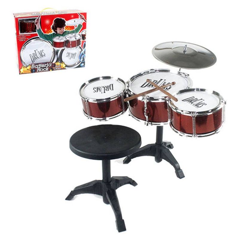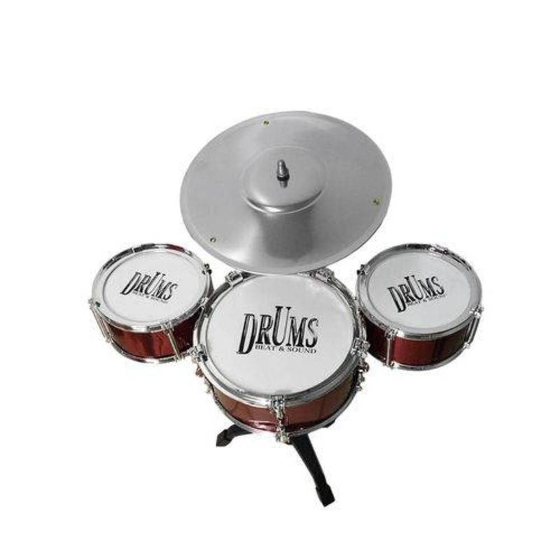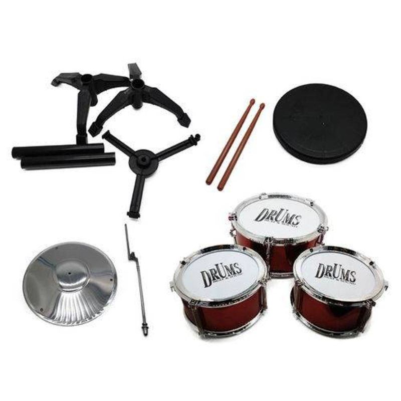 a Bateria Contém: 1 Tom Tom Grande, 2 Tom Tons Pequenos, 1 Prato, 2 Baquetas, 1 Suporte, 1 Pé de Banco e 1 Pé de Bateria.