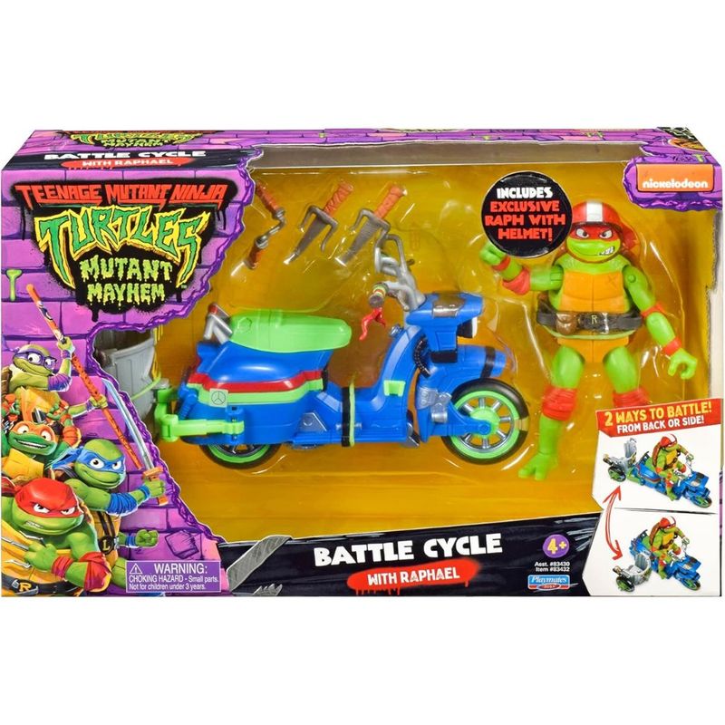 Quando uma Tartaruga não é suficiente para lidar com Super Fly e seu grupo, as Tartarugas chamam Raph e um de seus irmãos para entrar em ação e cuidar do problema! Eles pegaram a scooter de sua amiga April e a modificaram em um Battle Cycle com um carro lateral que se transforma, para que qualquer um dos quatro irmãos possa ir junto e lutar! O Battle Cycle de Raphael é autêntico e decorado exatamente como aparece no filme As Tartarugas Ninja: O Caos Mutante e vem com um boneco do Raphael exclusivo, com 12 pontos de articulação para movimentos de ação de batalha!