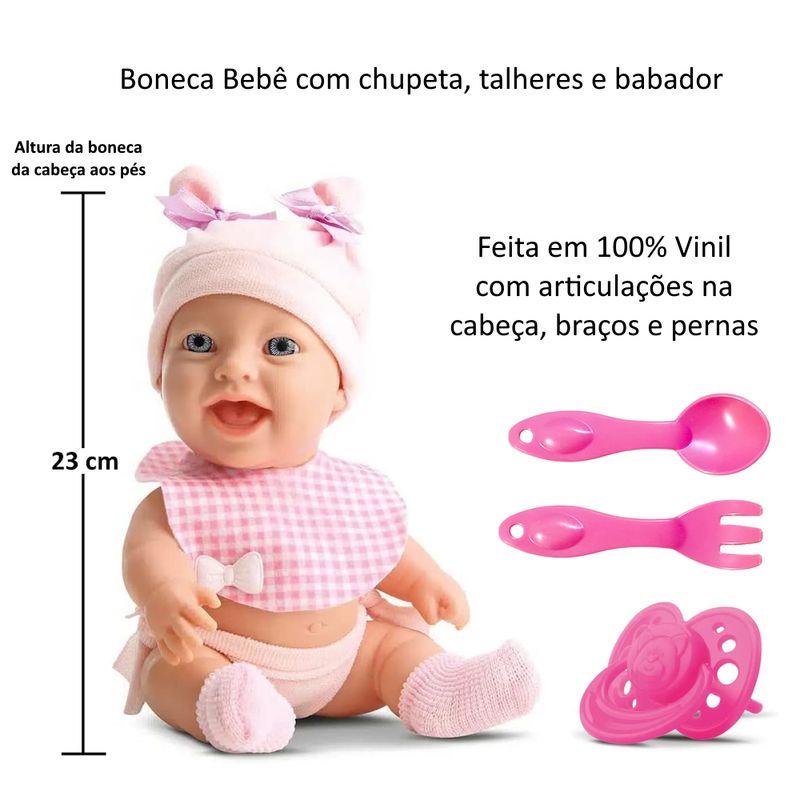 Boneca Bebê Com Chupeta Talheres e Babador Comidinha Baby's Papinha