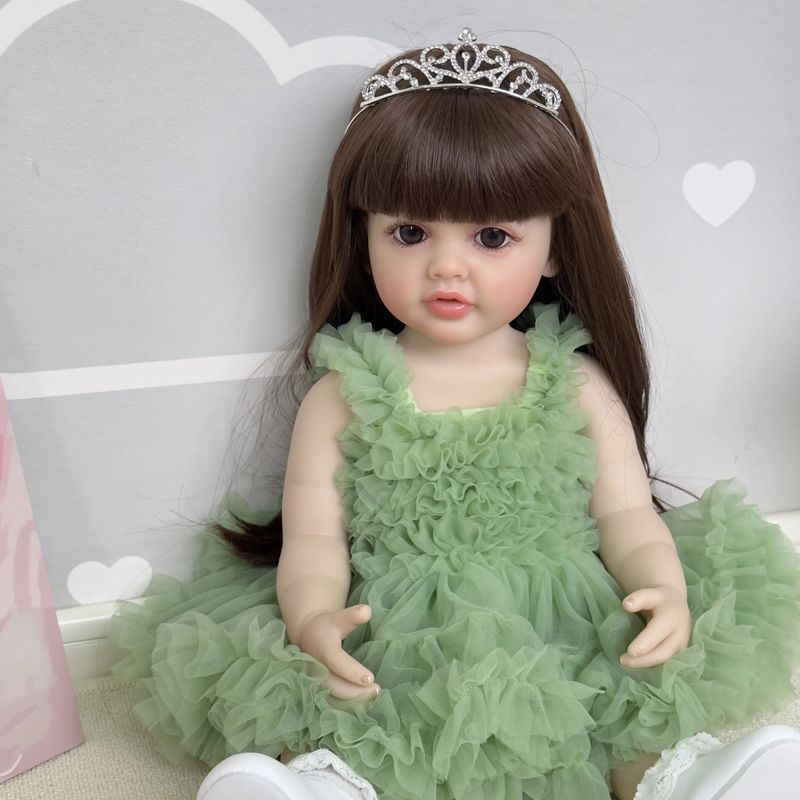 Estrutura: Todo o corpo é feito de Vinil 100% Silicone super macio; ela pode sentar-se ou deitar, não pode falar, não come, pode dar banho, movimenta braços e pernas, olhos não piscam;