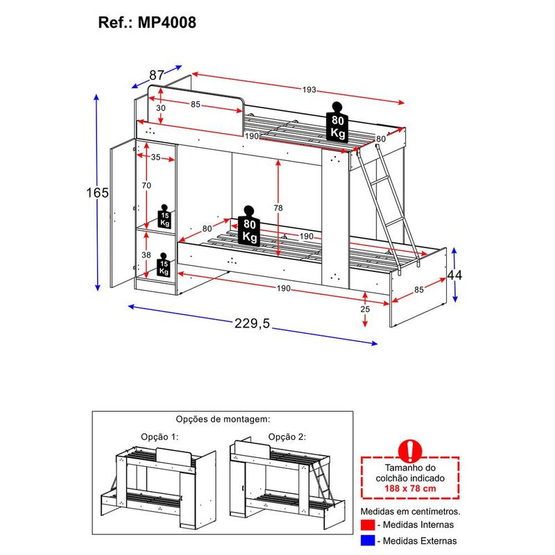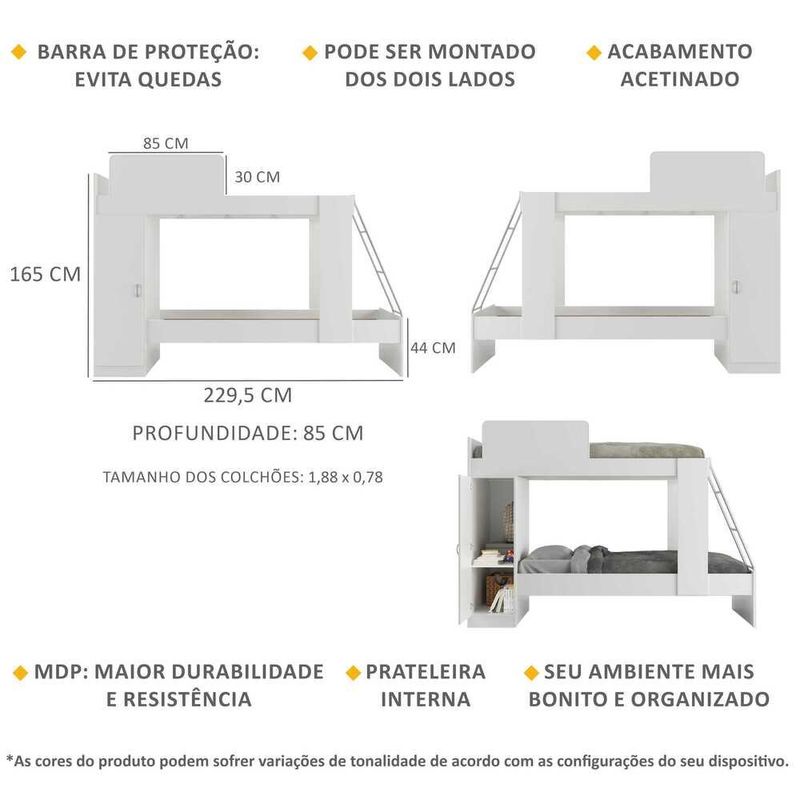 Produzido em MDP com acabamento acetinado (cerca de 20% de brilho), o Beliche 1 Porta Havana Multimóveis garante durabilidade e resistência. Suporta até 80kg em cada cama, possui barra de proteção na cama superior para evitar quedas, proporcionando noites de sono tranquilas e seguras, além de 1 porta lateral com prateleira interna, com amplo espaço interno para organizar roupas de cama ou pertences mais utilizados no dia a dia. A escada metálica em ângulo torna o acesso à cama superior muito mais fácil e prático. Além disso, o beliche pode ser montado dos dois lados - esquerdo ou direito. NÃO acompanha colchão (tamanho do colchão indicado: 188 x 78 cm). Esta é a escolha perfeita para deixar seu quarto mais convidativo para receber visitas ou acomodar seus filhos!Conteúdo da Embalagem: