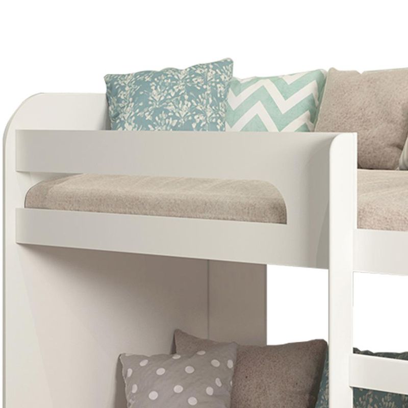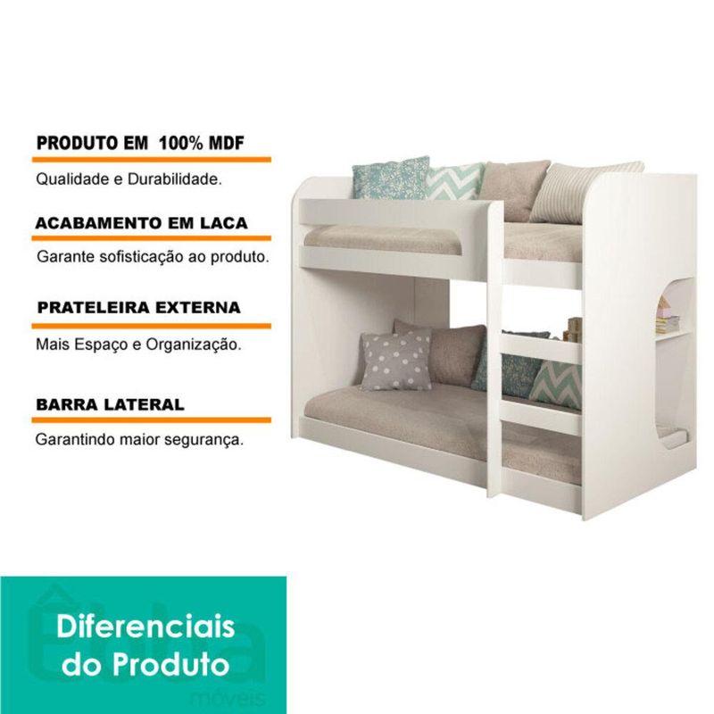 Beliche Ema Cimol BrancoO Beliche Ema é uma ótima escolha para você que busca otimizar o espaço do quarto, ele foi desenvolvido para deixar o seu ambiente mais agradável e mais sofisticado fazendo com o ambiente se torne super agradável e também único. Produzido em estrutura MDF, com acabamento em U.V, ajuda na resistência de mofos no móvel e possui revestimento em Laca/Fosco. Além disso, possui um design inovador, a cama superior do Beliche possui uma proteção lateral e uma prateleira próxima à cama inferior, oferecendo maior segurança e estilo.
