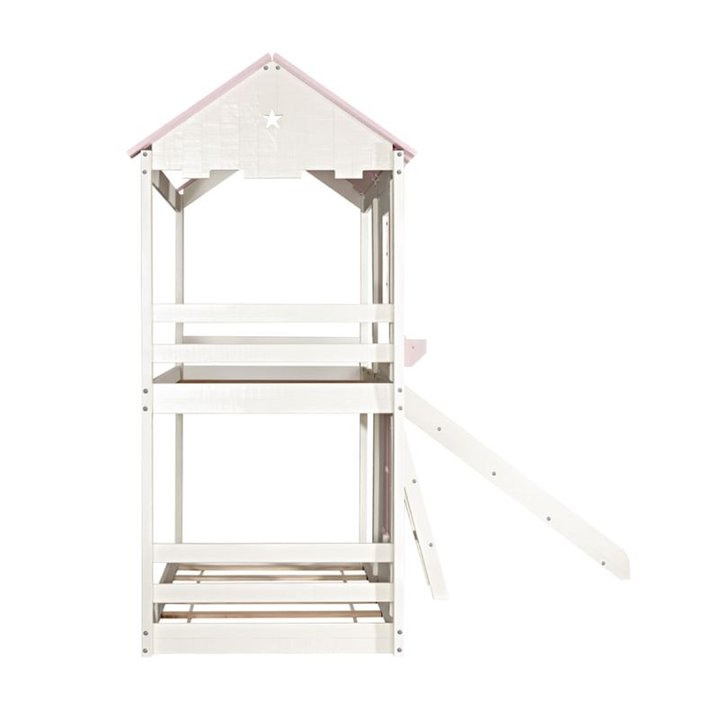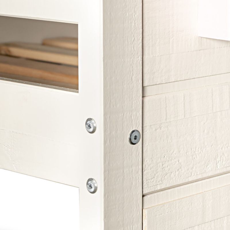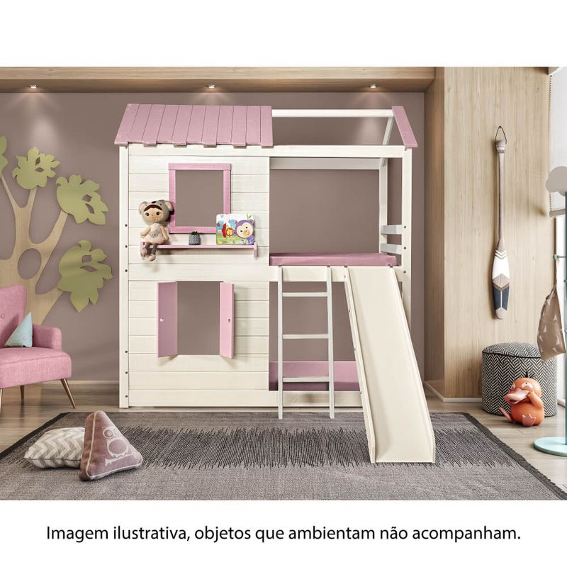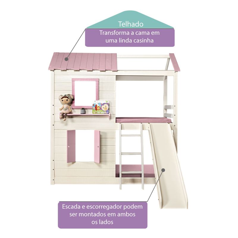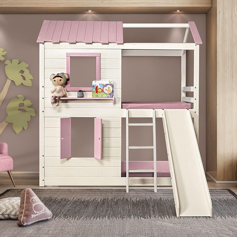 Projeto - O telhado e janelas trazem o lúdico para o ambiente, onde o beliche se transforma em uma casinha com janelas. A janela superior conta com 1 prateleira para colocar brinquedos e acessórios. Já a janela inferior abre e fecha, estimulando a imaginação das crianças. A escada com 3 degraus na parte frontal e o escorregador são removíveis e podem ser montados am ambos os lados. O escorregador traz as mais gostosas aventuras ao quarto. A cama da parte debaixo é no método montessoriano, onde a independência da criança é livre, podendo sozinha, subir e descer da cama. Uma peça ideal para trazer o lúdico, a diversão e a segurança para os dias e noites das crianças.