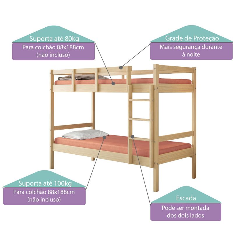 Projeto - A cama superior conta com grade em todo o redor garantindo maior segurança. A escada com 3 degraus pode ser montada do lado direito ou esquerdo, essa escolha deve ser feita conforme o posicionamento da cama no quarto, para facilitar o vai e vem diário no ambiente. Além disso, é possível transformar o beliche em duas camas de solteiro.