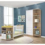 Jogo de quarto infantil, com um design lindo e sofisticado, deixando o ambiente ainda mais moderno e aconchegante. Estrutura em MDP de 15mm e 12mm, feito com material ecológicamente correto, para melhor durabilidade e resistência às peças, pintura atóxica livre de materiais pesados, e excelente acabamento UV (Brilho). Composto por portas de bater com dobradiças metálicas, gavetas externas com corrediças metálicas, puxadores em plástico com formato de estrela, cabideiro oblongo metálico, ótima divisão interna para roupas, estrado do berço em MDF de 6mm com altura regulável em três opções: 1ª: 35cm 2ª: 48cm e 3ª: 61cm, travessas em MDF de 25mm, grades fixas, bordas arredondadas com acabamento em perfil PVC, espaço para trocador, cantoneira com prateleiras, e suporte para mosquiteiro. O berço é certificado pelo InMetro, o colchão indicado é de 130x60cm. Mais produtos da linha infantil Doce Sonho, você encontra em nosso site, podendo fazer a composição completa para o quarto do seu (sua) filho (a). Estes móveis chegarão em sua casa separados em 04 volumes.