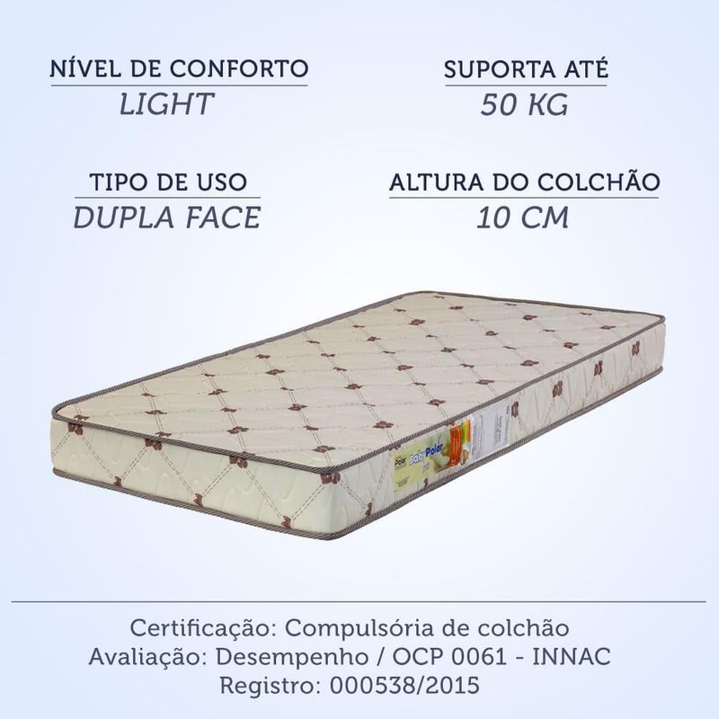 CARACTERÍSTICAS DO COCLHÃO: Espuma D18 kg/m3, tampo superior e inferior bordado, com tecido 100% poliéster na cor bege, gramatura 68g/m², medidas (C x L x A) cm 170 x 70 x 10, certificação compulsória, Registro 000538/2015, marca Colchões Polar