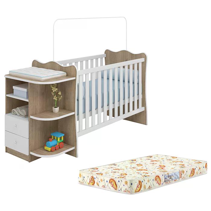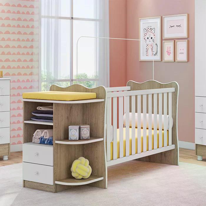 Berço infantil certificado pelo InMetro, conta com um design lindo e sofisticado, deixando o ambiente ainda mais moderno e aconchegante. Estrutura em MDP/MDF de 15mm, feito com material ecológicamente correto, para melhor durabilidade e resistência à peça, pintura atóxica livre de materiais pesados, e excelente acabamento UV (). Composto por estrado em MDF de 6mm com altura regulável em três opções: 1ª: 35cm 2ª: 48cm e 3ª: 61cm, travessas em MDF de 25mm, grades fixas, bordas arredondadas com acabamento em perfil PVC para maior segurança do bebê, gavetas externas com corrediças metálicas, puxadores de plástico em formato de estrela, trocador, cantoneira com prateleiras, e suporte para mosquiteiro. Um colchão com espuma 100% poliuretano flexível, revestimento em tecido poliéster, com bordado contínuo, densidade D18, tem tratamento antialérgico, e uma face em plástico que protege a superfície contra a penetração de líquidos. Suporta até 40 Kg distribuídos. Mais produtos da linha infantil Doce Sonho, você encontra em nosso site, podendo fazer a composição completa para o quarto do seu (sua) filho (a). Este móvel chegará em sua casa separado em 03 volumes.