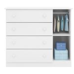 Cômoda possui puxadores de plástico, 4 gavetas, 1 porta, corrediças telescópicas e cabideiro.