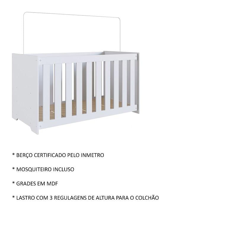 O Berço Branco Linha Aconchego da Completa Móveis é versátil, prático e elegante, com características que o destacam. Ideal para seu bebê, possui três opções para regulagem de altura do colchão, facilitando e o tornando prático para a mamãe e o papai no decorrer dos meses! Produto certificado pelo INMETRO.