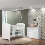 Jogo de quarto infantil, com um design lindo e sofisticado, deixando o ambiente ainda mais moderno e aconchegante. Estrutura em MDP de 15mm e 12mm, feito com material ecológicamente correto, para melhor durabilidade e resistência às peças, pintura atóxica livre de materiais pesados, e excelente acabamento UV (Brilho). Composto por gavetas externas com corrediças metálicas, porta de bater com dobradiças metálicas, prateleira com amplo espaço interno, sistema anti-tombamento para evitar riscos de acidentes, puxadores em plástico com formato de estrela, estrado do berço em MDF de 6mm com altura regulável em três opções: 1ª: 35cm 2ª: 48cm e 3ª: 61 cm, travessas em MDF de 25mm, grades fixas, bordas arredondadas, suporte para mosquiteiro, 04 rodízios de plástico, sendo 02 com trava de segurança e 02 sem trava de segurança, colchão com espuma 100% poliuretano flexível, revestido em tecido poliéster com bordado contínuo, densidade D18, e tratamento antialérgico com face em plástico que protege a superfície contra a penetração de líquidos. O berço pode ser montado como mini cama, após a transformação, acompanha duas laterais de proteção para noites mais seguras. Mais produtos da linha infantil Doce Sonho, você encontra em nosso site, podendo fazer a composição completa para o quarto do seu (sua) filho (a). Estes móveis chegarão em sua casa separados em 05 volumes.