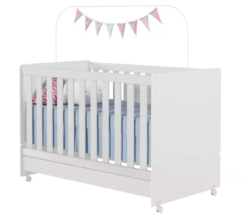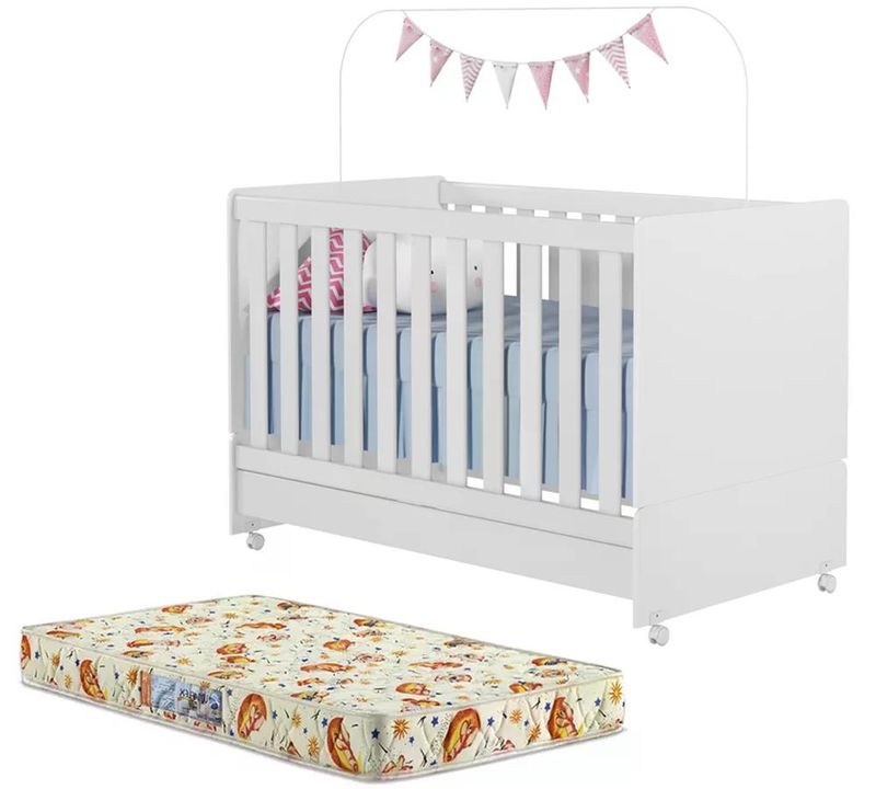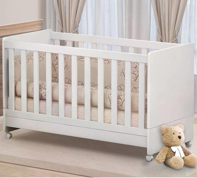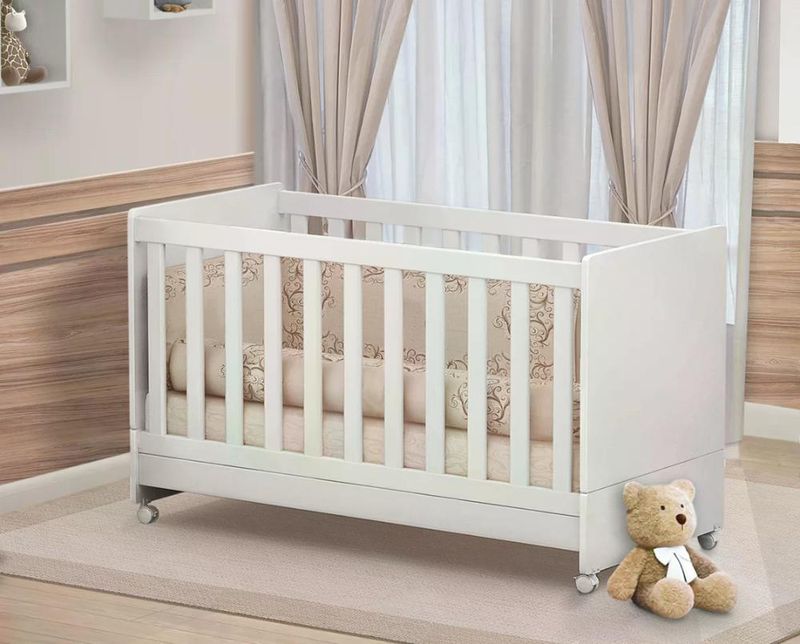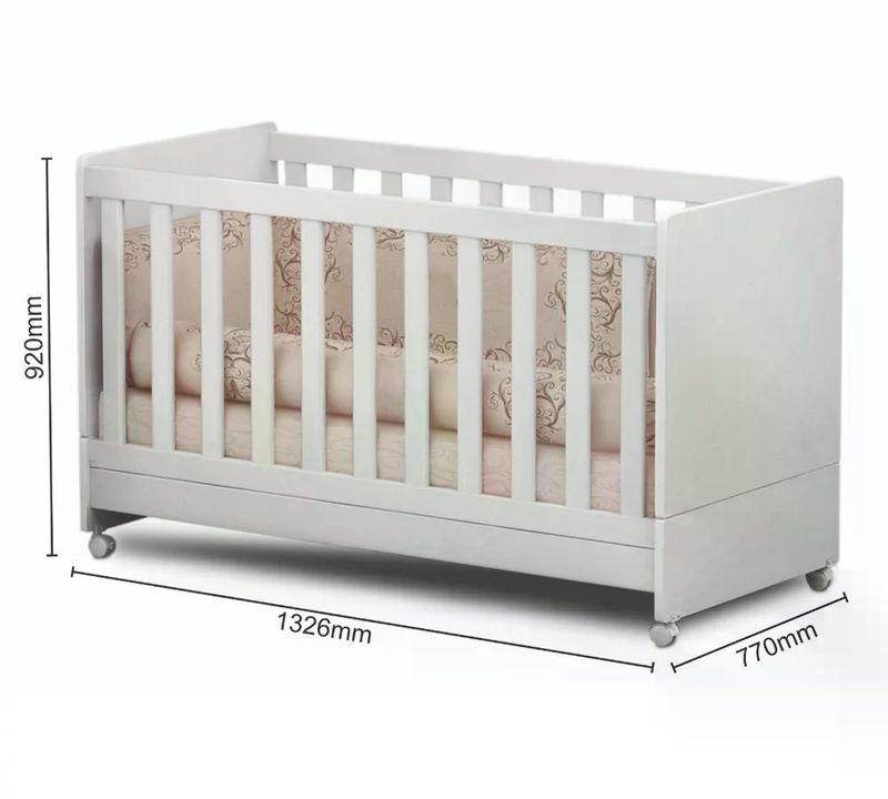 Berço Mini Cama Encanto, Certificado pelo Inmetro 0033/001368-2020, seu padrão é de berço americano e posteriormente poderá ser transformado em uma mini cama, estrutura em MDP bio-sustentável de 15 mm de espessura, acabamento em pintura UV (Fosco e Alto Brilho). Superfícies e bordas lisas e arredondadas para evitar acidentes, estrado resistente em MDF, 02 regulagens de altura, grades fixas de MDF para melhor segurança do bebê, suporte para mosqueteiro, suporta até 30 Kg, possui 04 rodízios sendo dois com trava, transforma-se em mini cama acompanhando o crescimento do seu filho, acompanha colchão medindo 70cm x 130cm certificado pelo INMETRO, espuma 100% poliuretano flexível, revestimento em tecido poliéster, com bordado contínuo, densidade D18, com uma face em plástico que protege a superfície contra a penetração de líquidos, tratamento antialérgico, produzido com Alto Controle de Qualidade Garantindo segurança e conforto para seu bebê. Este móvel chegará em sua casa separado em 03 volumes.