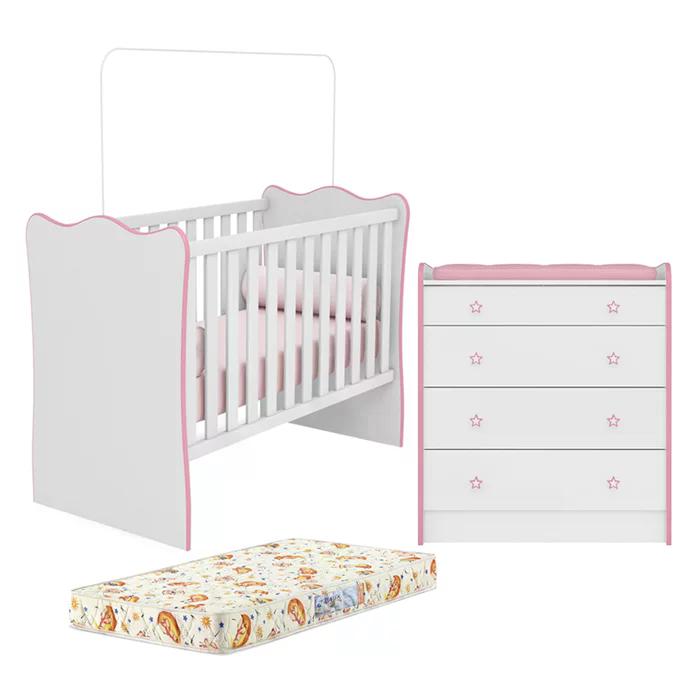 Jogo de quarto infantil, com um design lindo e sofisticado, deixando o ambiente ainda mais moderno e aconchegante. Estrutura em MDP de 15mm e 12mm, feito com material ecológicamente correto, para melhor durabilidade e resistência às peças, pintura atóxica livre de materiais pesados, e excelente acabamento UV (Brilho). Composto por gavetas externas com corrediças metálicas, puxadores em plástico com formato de estrela, trocador embutido que garante mais praticidade no dia-dia, bordas arredondadas em perfil PVC, estrado do berço em MDF de 6mm com altura regulável em três opções: 1ª: 35cm 2ª: 48cm e 3ª: 61cm, travessas em MDF de 25mm, suporte para mosquiteiro, sistema anti-tombamento para evitar riscos de acidentes, colchão com espuma 100% poliuretano flexível, revestido em tecido poliéster com bordado contínuo, densidade D18, e tratamento antialérgico com face em plástico que protege a superfície contra a penetração de líquidos. O berço é certificado pelo InMetro. Mais produtos da linha infantil Doce Sonho, você encontra em nosso site, podendo fazer a composição completa para o quarto do seu (sua) filho (a). Estes móveis chegarão em sua casa separados em 04 volumes.