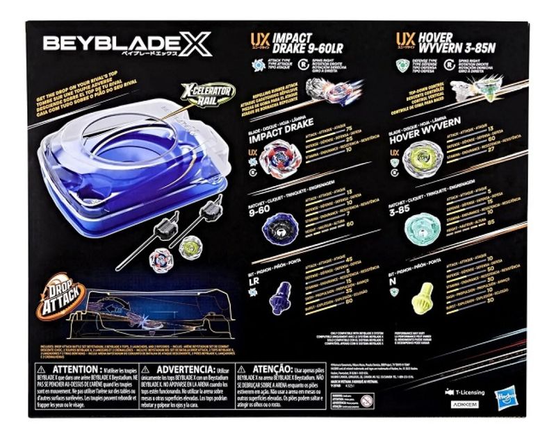 Beyblade X 2.0 Drop Attack - Kit de Batalha Ataque Descendente 1 Arena, 2 Piões e 2 lançadores - Hasbro O conjunto de batalha Beyblade X Ataque Descendente tem tudo o que se precisa para começar a batalhar - Beystadium, 2 piões e 2 lançadores! Com o trilho X-Celerator da arena Beystadium, os piões são lançados com um Xtreme Dash e alcançam velocidades surpreendentes que geram eclosões incríveis e impactos colossais. E com esta arena Beystadium, pode-se atacar o pião do seu oponente de cima - o trilho X-Celerator elevado do estádio pode enviar os piões Beyblade para uma elevação, onde eles podem cair sobre os oponentes! Usar os 2 lançadores para lançar o pião do tipo ataque Impact Drake 9-60LR e o pião do tipo defesa Hover Wyvern 3-85N em um frenesi de fúria. Os bladers lançam os seus piões contra os dos oponentes. O primeiro com 4 pontos é o vencedor. Os fãs podem personalizar as camadas intercambiáveis da lâmina, engrenagem e ponta com outros piões Beyblade X (vendidos separadamente). Os brinquedos Hasbro Beyblade com metal fundido Takara Tomy autêntico são excelentes presentes para meninos e meninas a partir dos 8 anos. Idade acima de 8 anos Contem 1 arena 2 pioes 2 lançadores Tamanho da embalagem 48 x 37 x 9 cm Fabricante Hasbro