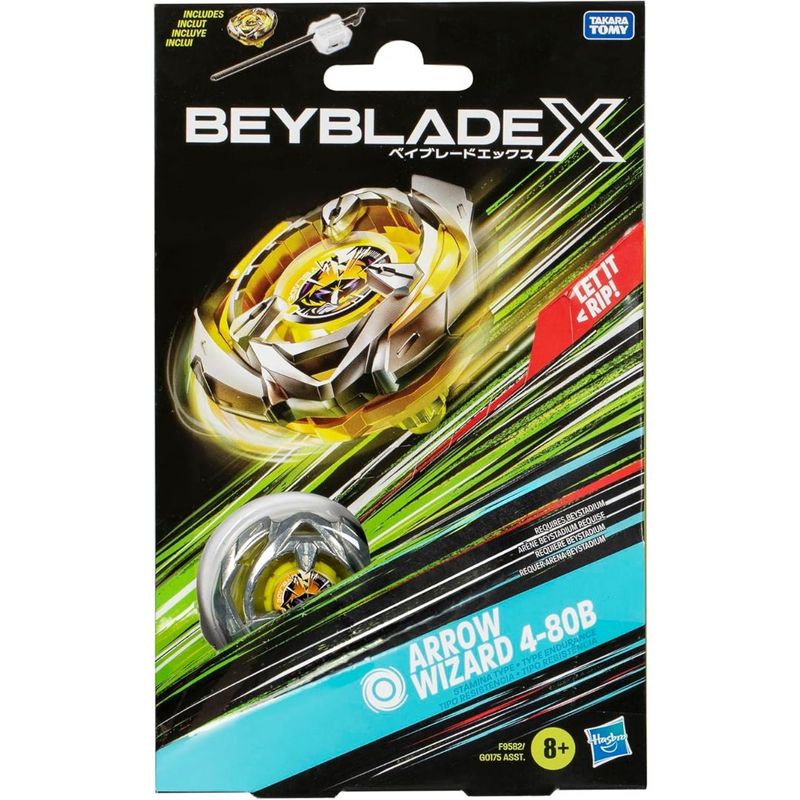 Toda a emoção da nova geração de arenas, lançadores e piões Beyblade: Este kit Inicial Beyblade X inclui 1 pião Wizard 4-80B tipo resistência e giro à direita e 1 lançador (requer Arena Beystadium required, vendida separadamente). Entrar direto na batalha ou personalizar as camadas intercambiáveis da lâmina, engrenagem e ponta com outros piões Beyblade X (vendidos separadamente). O Beyblade X traz o sistema de engrenagem X-Celerator para elevar a batalha. Quando as engrenagens do pião Beyblade X encontram a guia da arena Beystadium, os piões são lançados com um avanço Xtreme e alcançam velocidades surpreendentes que geram eclosões incríveis e impactos colossais. Os fãs lançam os seus piões em batalhas selvagens contra os seus oponentes. O primeiro a marcar 4 pontos é o vencedor. Os brinquedos Hasbro Beyblade com metal fundido Takara Tomy autêntico são excelentes presentes para meninos e meninas a partir dos 8 anos. Hasbro and all related trademarks and logos are trademarks of Hasbro, Inc.
