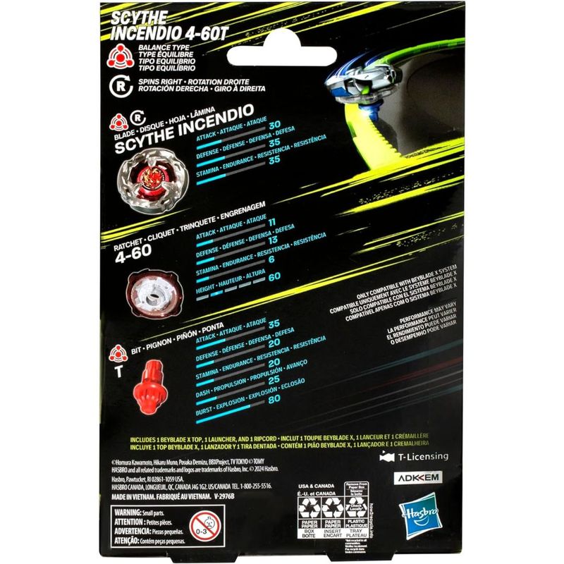 Toda a emoção da nova geração de arenas, lançadores e piões Beyblade: Este kit Inicial Beyblade X inclui 1 pião Scythe Incendio 4-60T tipo equilíbrio e giro à direita e 1 lançador (requer Arena Beystadium required, vendida separadamente). Entrar direto na batalha ou personalizar as camadas intercambiáveis da lâmina, engrenagem e ponta com outros piões Beyblade X (vendidos separadamente). O Beyblade X traz o sistema de engrenagem X-Celerator para elevar a batalha. Quando as engrenagens do pião Beyblade X encontram a guia da arena Beystadium, os piões são lançados com um avanço Xtreme e alcançam velocidades surpreendentes que geram eclosões incríveis e impactos colossais. Os fãs lançam os seus piões em batalhas selvagens contra os seus oponentes. O primeiro a marcar 4 pontos é o vencedor. Os brinquedos Hasbro Beyblade com metal fundido Takara Tomy autêntico são excelentes presentes para meninos e meninas a partir dos 8 anos. Hasbro and all related trademarks and logos are trademarks of Hasbro, Inc.