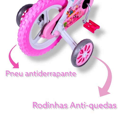 Bicicleta feminina infantil Styll Baby aro 12 quadro e garfo fabricado em aço de carbono de altíssima qualidade manoplas e manetes anatômicos cobre e corrente mais seguro com fechamento completo, rodas para-lamas protetores selim fabricados em plástico de alta resistência. Pneu sem câmera em EVA mais macio e silencioso, contém rodinhas laterais auxiliares.