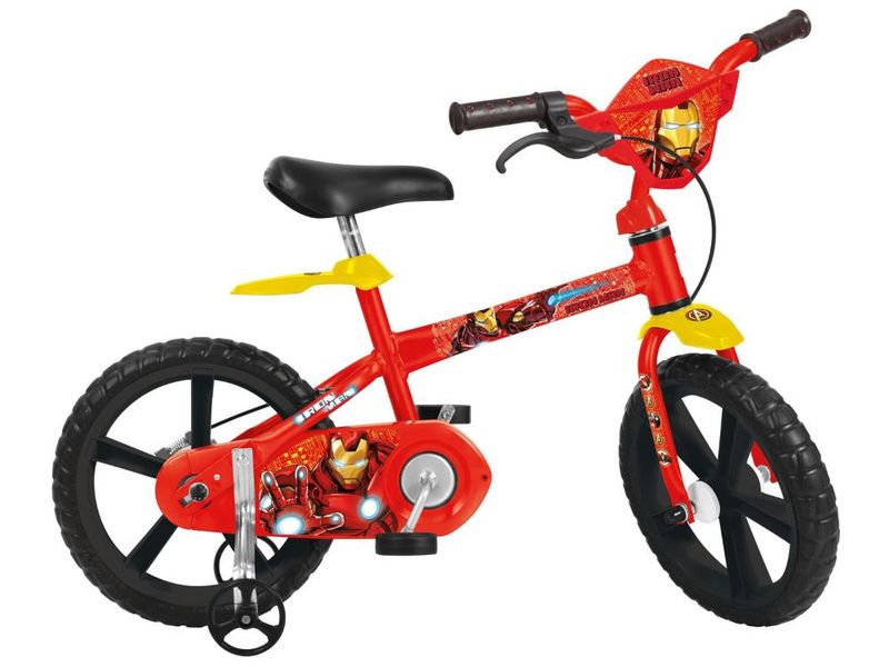Os meninos estarao prontos para combater os viloes com esta bicicleta com o novo guidao, novo selim acolchoado, rodinhas laterais, cobre-corrente integral, novo pe de vela, novo freio, novas rodas e pneus. O guidao tem limitador de giro e carenagem frontal com a imagem do seu heroi favorito.
