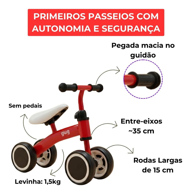 A Bicicleta de Equilíbrio Baby Glumi foi feita para os primeiros passeios com autonomia e segurança. Sem pedais e levinha, ela convida o bebê a impulsionar com os pés e descobrir o equilíbrio de forma natural. As rodas largas de 15 cm dão firmeza, o entre-eixos de cerca de 35 cm estabiliza a direção e o guidão ajustável acompanha o crescimento.