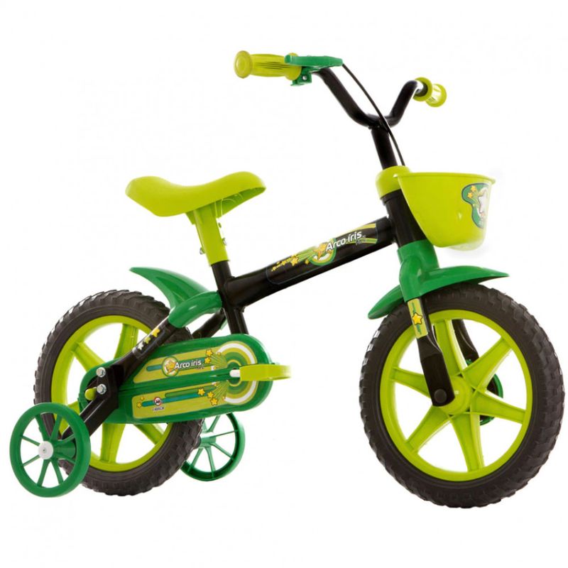 Bicicleta infantil Aro 12, com quadro em aço caborno, freios a tambor, rodas e selim em nylon e pneus em EVA.