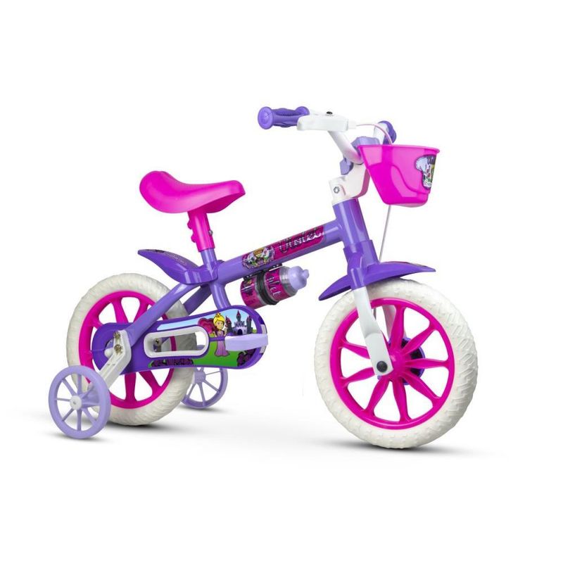 bicicleta infantil feminina, aro 12, quadro em aço carbono, selim com regulagem de altura, freio dianteiro, mesa de guidão com regulagem