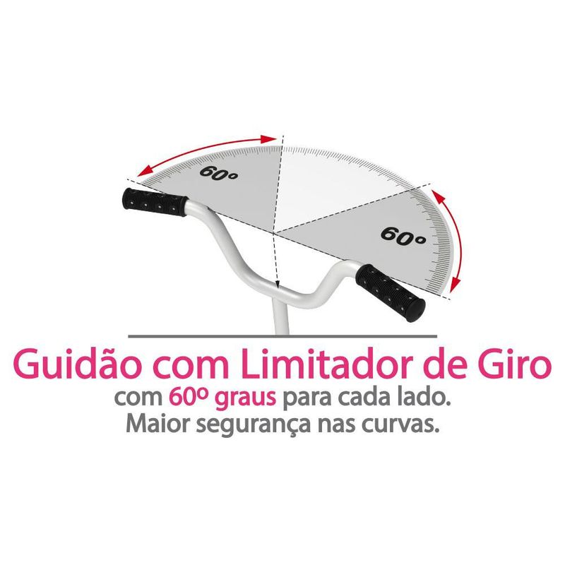 - Pneus de borracha com câmara. Freio V-Brake.- Movimento de direção e central com esferas.- Guidão com limitador de giro e regulagem de altura para melhor ergonomia.- Manoplas em TPE atóxico.- Carenagem removível.- Rodinhas laterais removíveis fixadas no quadro, que ajudam na conquista do equilíbrio e auxiliam na aprendizagem.- Selim anatômico acolchoado com regulagem de altura.- Cobre corrente integral.- Idade: +5 anos.- Peso máximo suportado: 30kg.- Certificado Inmetro: CE-BRI/INNAC-00580-01A.