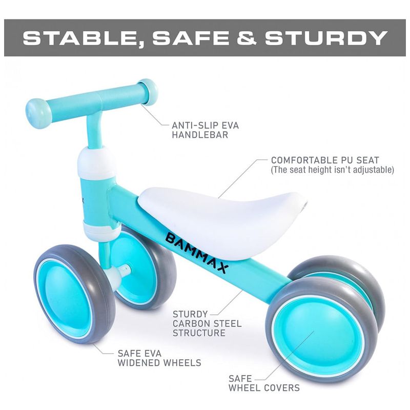 ESTÁVEL, E ROBUSTO Este brinquedo de passeio de bebê apresenta uma estrutura de carbono resistente, rodas grandes, uma distância entre eixos dianteira alargada para equilíbrio ideal, protetores de roda para segurança e direção anti queda.