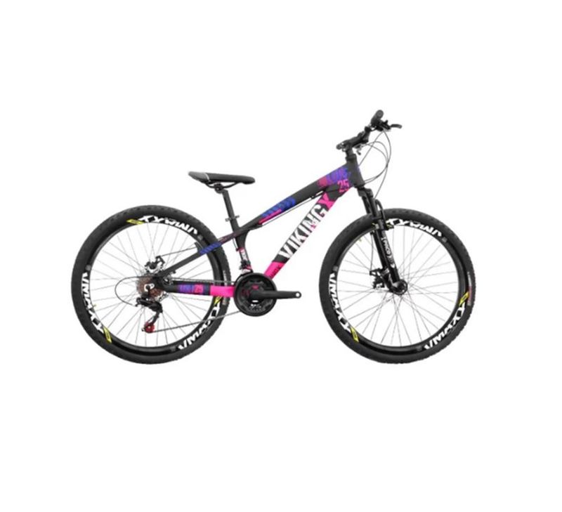 - Foto Meramente Ilustrativa- Marca: VikingX- Quadro Alumínio- Idade recomendada: Juvenil/Adulto- Gênero: Unissex- Aro: 26- Velocidades 21 Marchas- Garfo: Suspensão Mecânica- Guidão: Aço carbono Mtb- Freios: Disco Mecânico- Rodas: Vmaxx- Câmbios: Importados ;- Manoplas: Mtb Simples- Corrente: Index- Selim: Mtb Simples- Trocador: Rapid fire importado- Pedivela: Importado- Pneus: Mtb com cravo Balão ;- Pedal: Plástico Mtb- Modelo da bicicleta: MtbOBSERVAÇÕESPode haver alguma diferença de tonalidade entre a imagem e o produto real, por conta do tratamento de imagens e a calibração de cores do monitor.MONTAGEMEnviamos a bicicleta pré-montada, revisada e devidamente embalada, para melhor se acomodar na embalagem de transporte são retirados apenas: selim, pedais, guidão e roda dianteira.O custo da montagem é de responsabilidade do cliente.Por motivo de transporte e manuseio, é necessário efetuar uma nova regulagem de câmbio ao receber o produto. ;