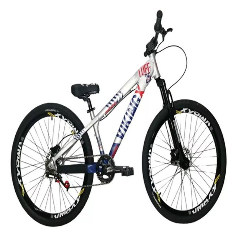 Bicicleta Vikingx Prata Azul Aro 26 Single Wheeling Freio Hidráulico- Foto Meramente Ilustrativa- Marca: VikingX- Quadro AlumínioIdade recomendada: Juvenil/Adulto- Gênero: Unissex- Aro: 26- Velocidades: Single- Garfo: Suspensão Mecânica- Guidão: Aço carbono Mtb- Freios: Disco Hidraulico- Rodas:Vmaxx- Câmbio: Traseiro Importados- Manoplas: Mtb Simples- Corrente: Index- Selim: BMX- Pedivela: Single GTS- Pneus: Mtb com cravo, CONFORME NOSSO ESTOQUE DISPONIVEL- Pedal: Plástico MtbModelo da bicicleta: MtbOBSERVAÇÕESPode haver alguma diferença de tonalidade entre a imagem e o produto real, por conta do tratamento de imagens e a calibração de cores do monitor.MONTAGEMEnviamos a bicicleta pré-montada, revisada e devidamente embalada, para melhor se acomodar na embalagem de transporte são retirados apenas: selim, pedais, guidão e roda dianteira.O custo da montagem é de responsabilidade do cliente.Por motivo de transporte e manuseio, é necessário efetuar uma nova regulagem de câmbio ao receber o produto.Não nos responsabilizamos pela revisão final da bicicleta, sugerimos que seja efetuada por uma oficina especializada.GARANTIANÃO COBRE DEFEITOS POR MAU USO OU PELA MONTAGEM, REGULAGEM DE CÂMBIOS OU REVISÃO INADEQUADA DO PRODUTO.A garantia será validada para as bicicletas montadas e revisadas por uma oficina especializada e é referente apenas ao primeiro proprietário.A garantia não se aplica para os itens de desgaste natural, tais como: Pneu, câmaras, cabos, sapatas ou pastilhas de freio, centragem de aros, pintura do quadro, componentes da transmissão (câmbios, corrente, engrenagens do pé de vela, engrenagens do cassete).