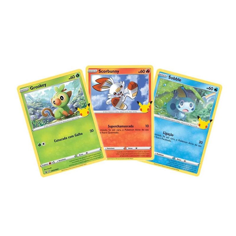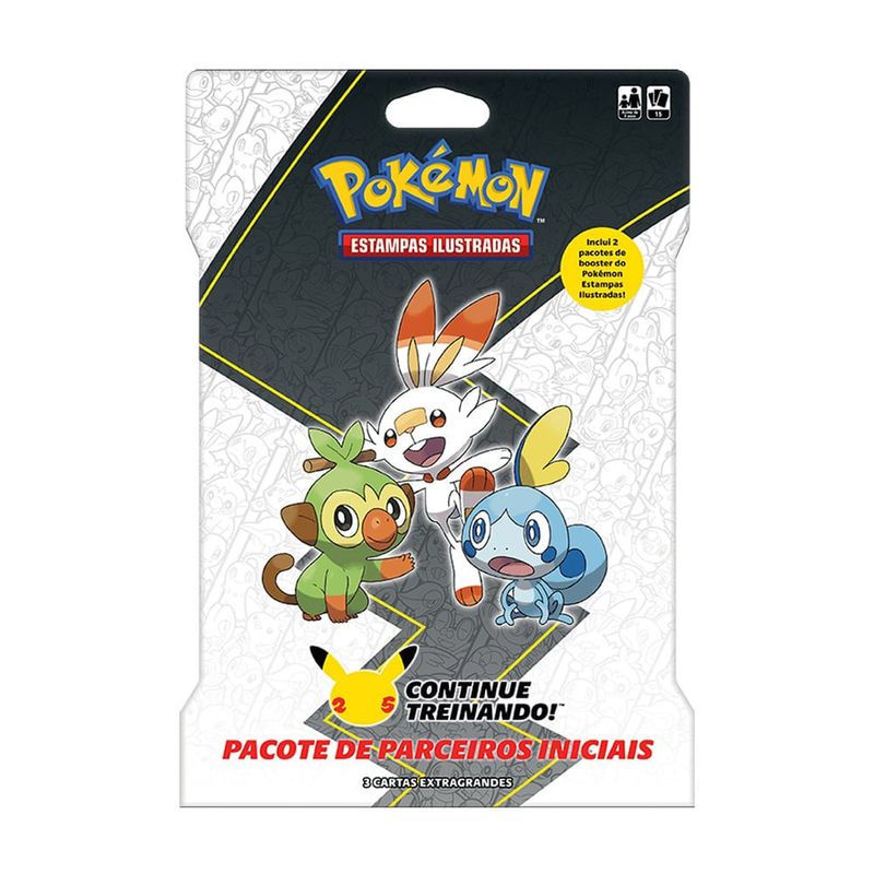 - Celebre nossos 25 anos de uma maneira gigantesca! Participe de uma grande festa cheia de cartas gigantes do Pokémon Estampas Ilustradas! O pacote de parceiros iniciais conta com 3 cartas extragrandes para a sua coleção, apresentando os Pokémon iniciais da região de Galar, Grookey, Scorbunny e Sobble, além de 2 pacotes de booster normais do Pokémon Estampas Ilustradas! Colecione e troque os seus Pokémon preferidos, e celebre os 25 anos incríveis de Pokémon com os parceiros iniciais que estiveram ao seu lado desde os primeiros momentos! Contém 12 unidades de cartas de Pokémon