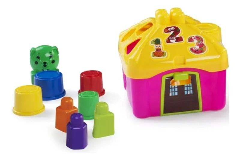 – Conteúdo da Embalagem: Contém: 1 casinha, 1 telhado de encaixe, 4 copos, 1 rostinho e 3 formas geométricas. Acompanha cartela de adesivos.