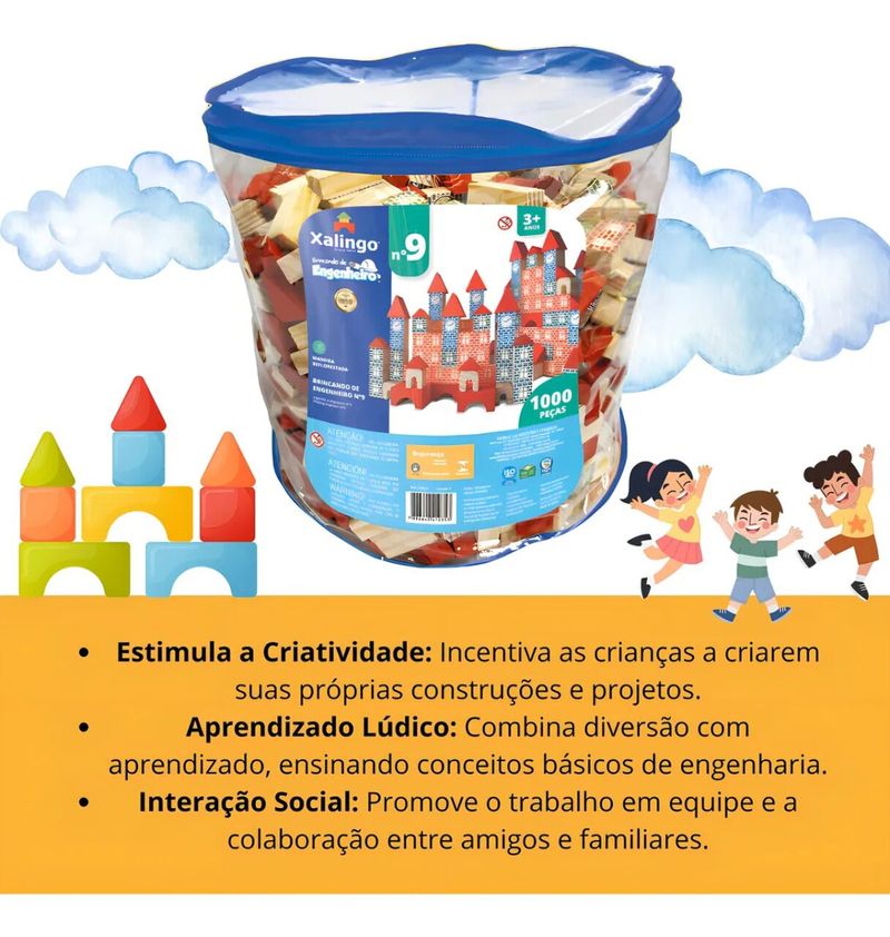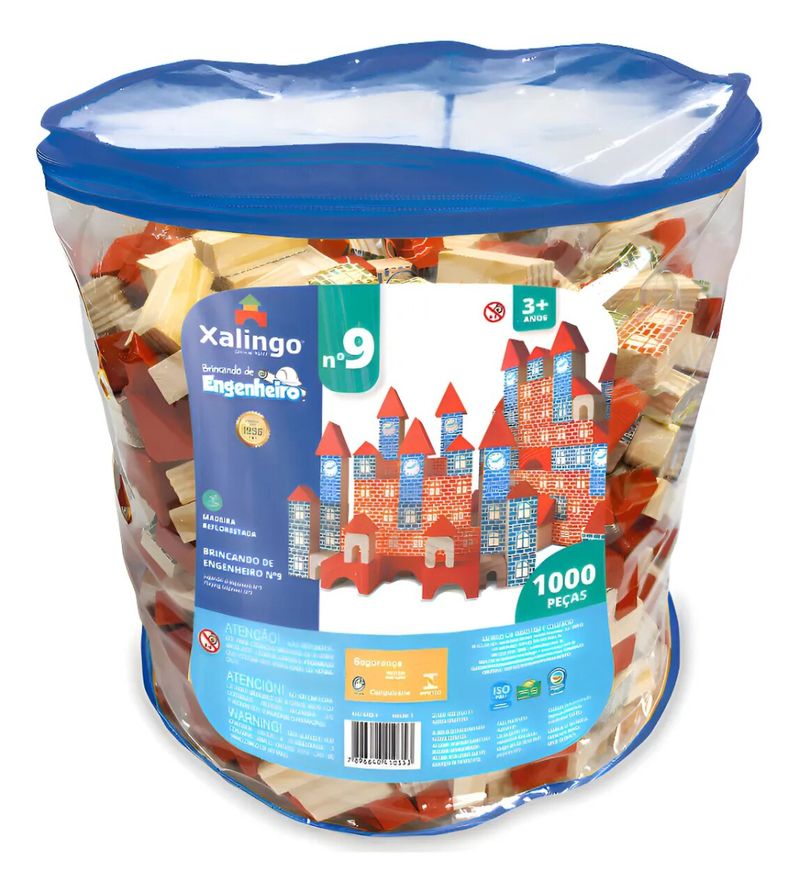Desperte o engenheiro dentro de você com o novo modelo do Brincando de Engenheiro, agora com ainda mais peças! O Brincando de Engenheiro N° 9, é composto por 1.000 peças confeccionadas em madeira reflorestada e tinta atóxica. São diversos formatos que possibilitam montagens infinitas, podendo montar agora super cidades, do tamanho que você quiser! O brinquedo é perfeito para auxiliar no desenvolvimento do pensamento lógico, imaginação, criatividade, noções espaciais, relações parte e todo, além da coordenação motora.